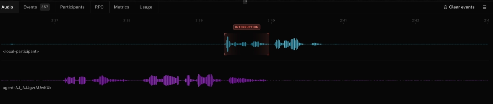Agent Console is a realtime debugging surface built to close that gap. It gives you a live view of your voice agent session across audio, events, latency, tool calls, transcripts, session and participant state, RPC traffic, DTMF (dual-tone multi-frequency), and usage so you can inspect the system as it runs instead of reconstructing it from partial evidence after the fact. It also supports video tracks for avatar-based agents.