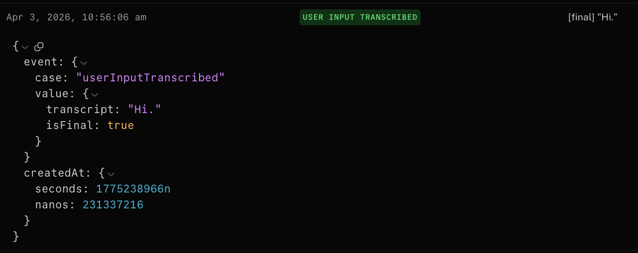 Developers need to see what happened in the session, not just what the code intended to do. Standard logs don't show audio timing, live participant state, or the exact sequence of events behind an awkward pause or broken tool call.