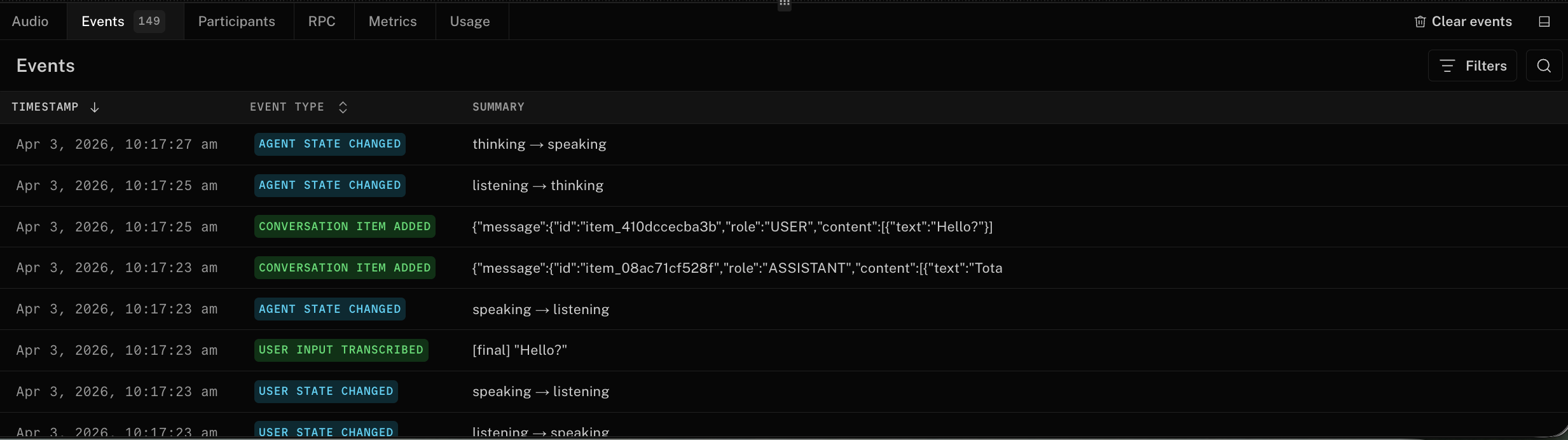 The Events view shows the sequence of state transitions that explain what the agent did in order: participant updates, conversation items, interrupts, tool calls, and other session events as they happen. Instead of piecing behavior together from scattered logs, you see the full event stream in context.