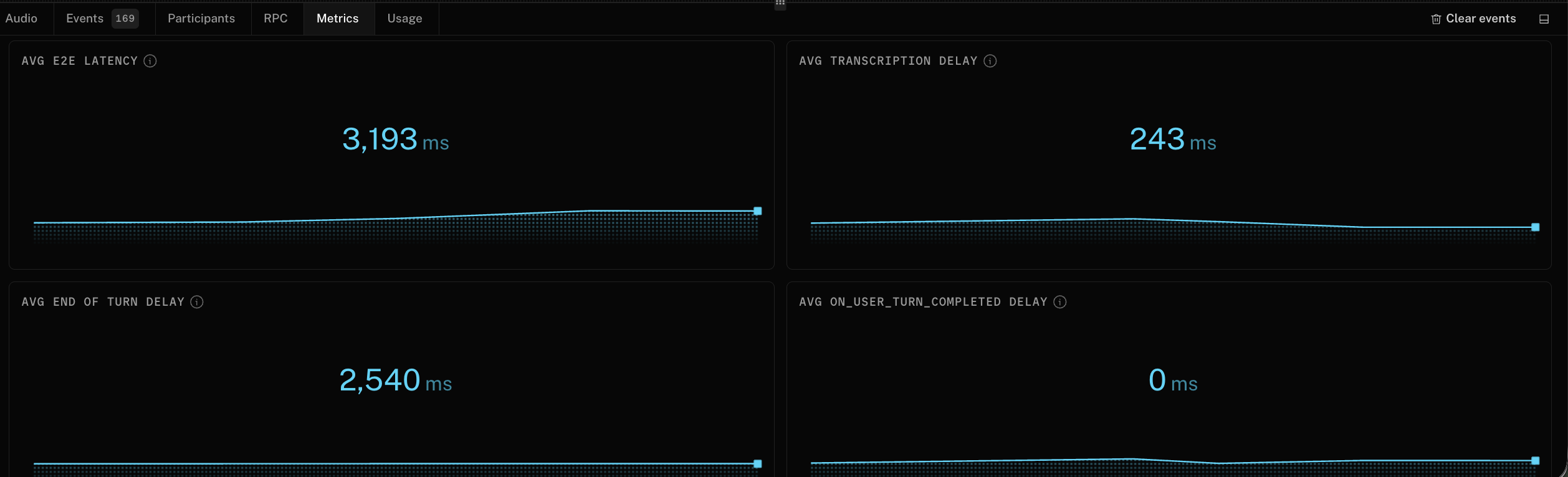The Metrics view shows the latency profile of the session in real time. If the agent feels slow, you can immediately see whether the bottleneck is LLM time to first token, end-to-end turn latency, endpointing (how the system detects you've stopped speaking), or another pipeline stage.