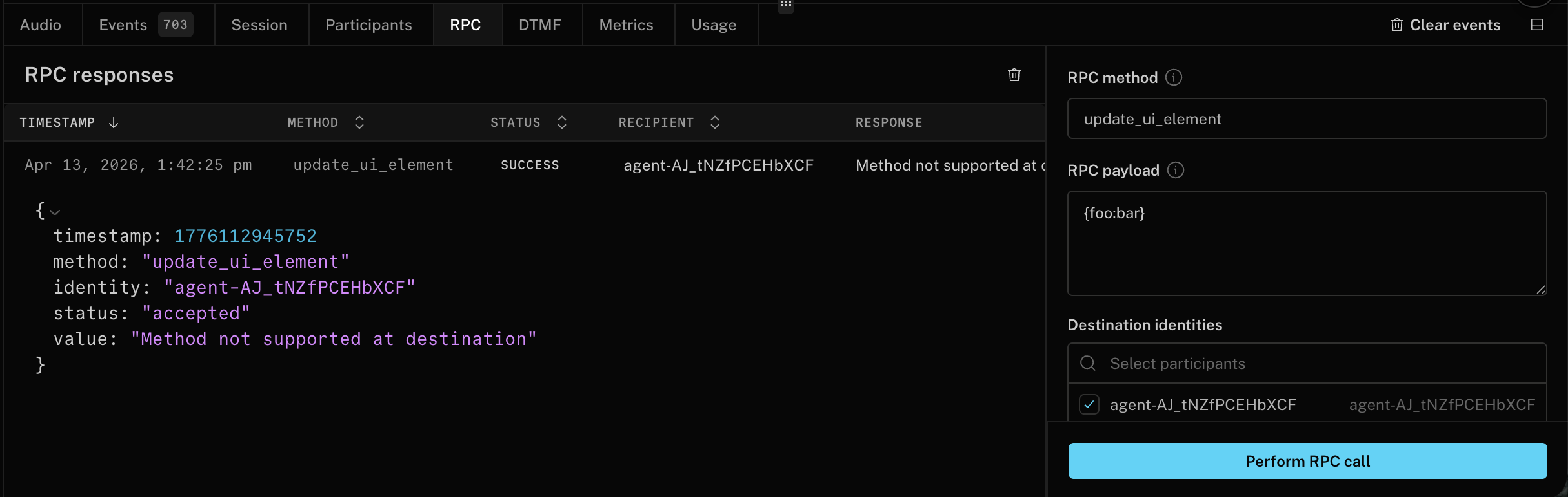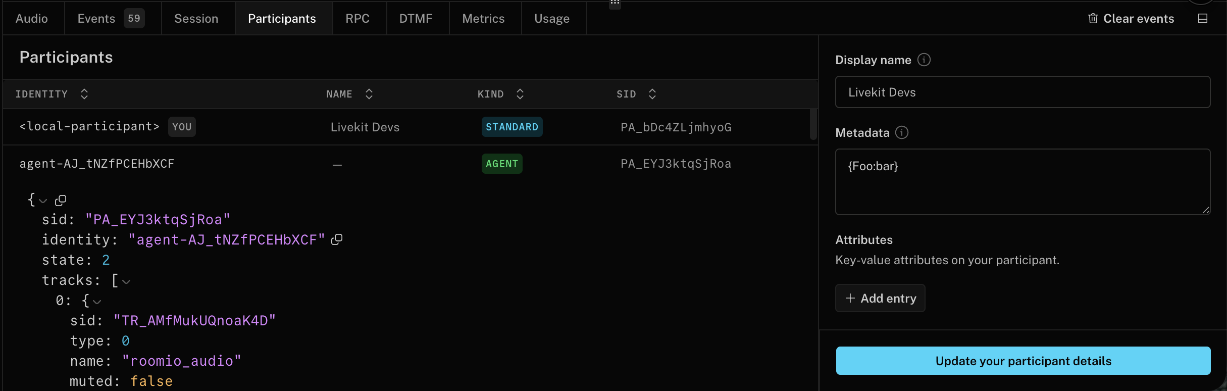 The Participants, RPC, and DTMF views let you inspect participant attributes and metadata, update them live, test RPC flows, and send keypad input for telephony and IVR scenarios, because debugging a real voice agent often means debugging signaling and session context, not just the spoken audio.