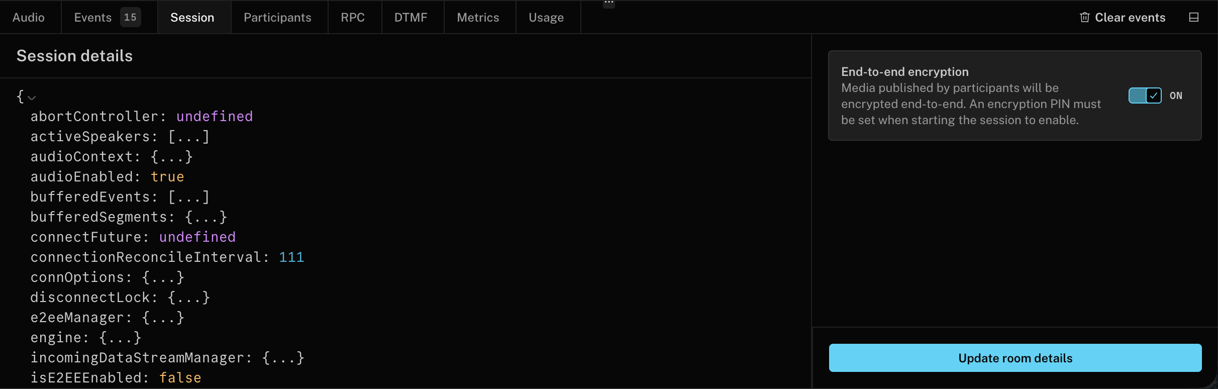 The Session view gives you a raw, live view of the Room object so you can inspect room configuration, current speaker state, server region, negotiated protocols, codecs, and other low-level session details without digging through logs.