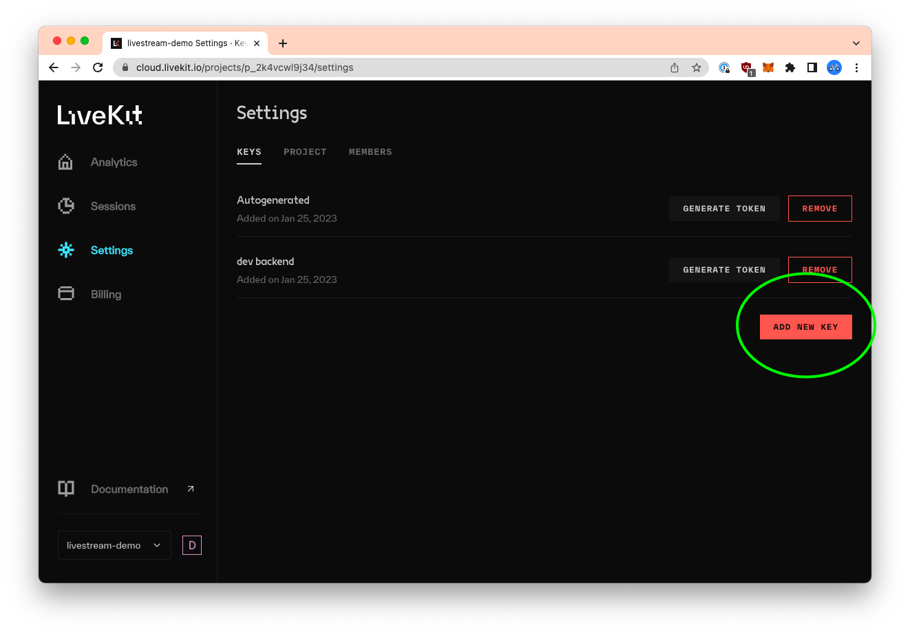 Once you’ve created a project, you’ll need to generate your keys. This can be done in the settings page of the project.