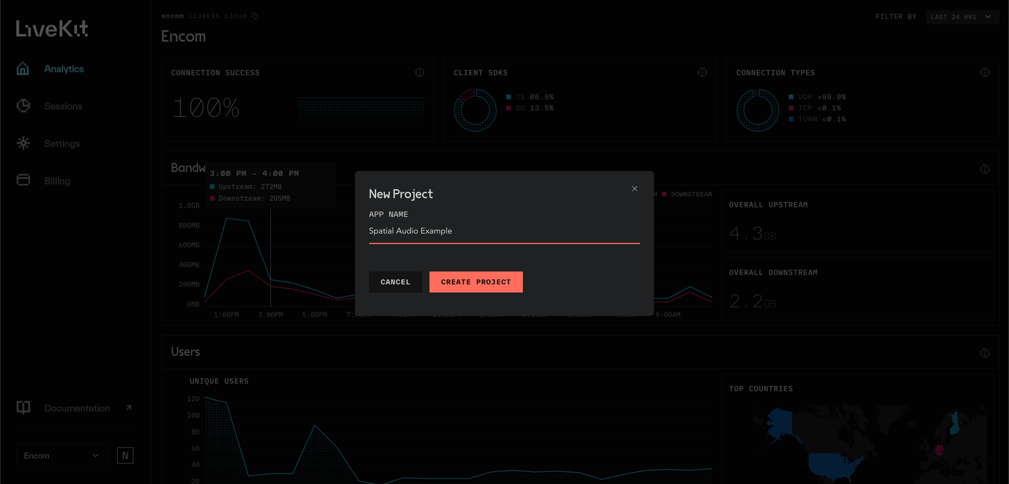 Once you’ve signed into LiveKit Cloud with your preferred method, you’ll be prompted to create a new project. Create this project with whatever name you like.