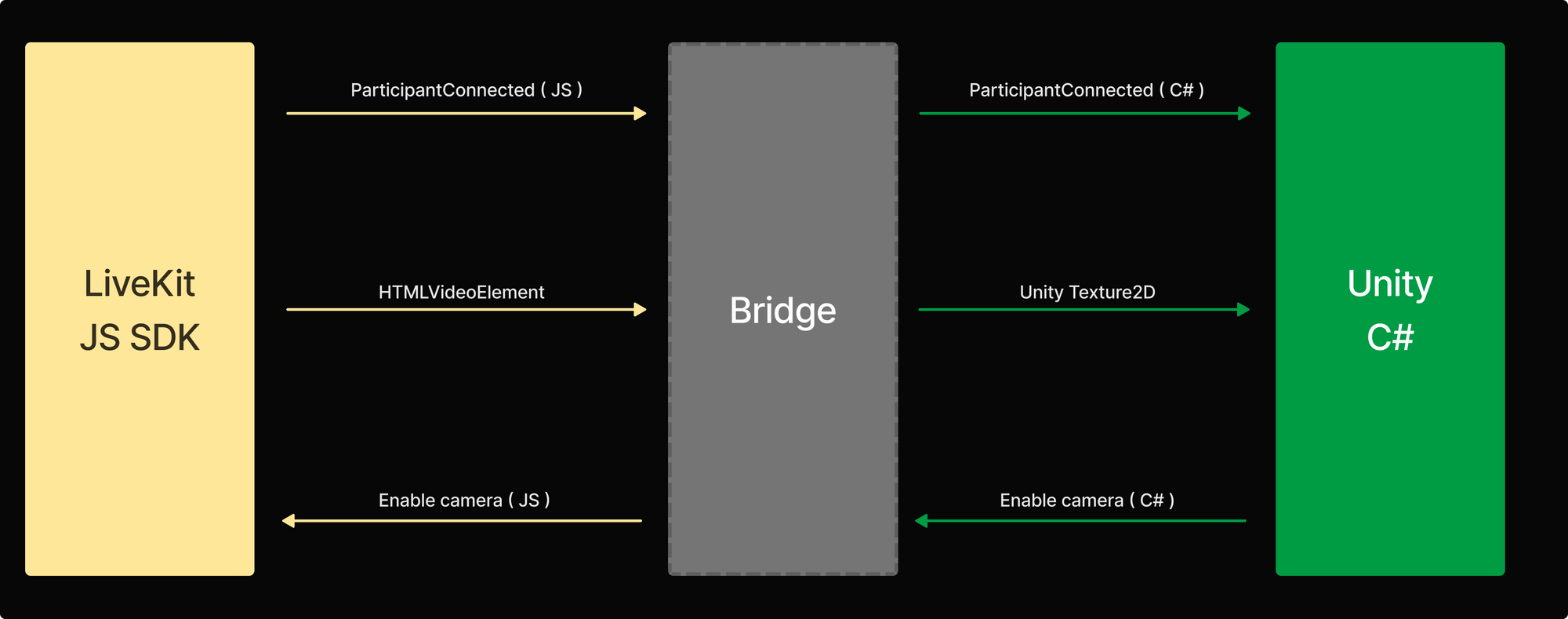 We spoke to a few developers of browser-based Unity applications, who built real-time audio and video features to help their users connect and interact. We learned they manage game state within the Unity/C# execution environment and write separate JavaScript (JS) code to leverage the browser's WebRTC (libwebrtc) implementation for audio and video. Messages about player state are passed from Unity to JS via bridge and video frames travel from JS to Unity–where they are converted to a 2d texture and applied to a game object–using the same mechanism. Sometimes overlay menus are implemented in C# with events triggered in JS, other times, the reverse! 😵💫