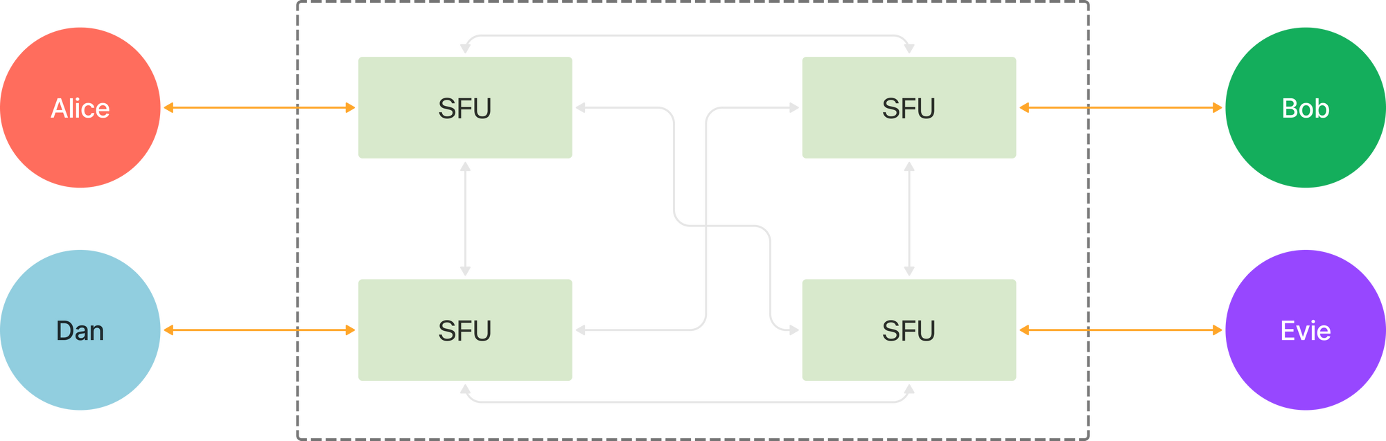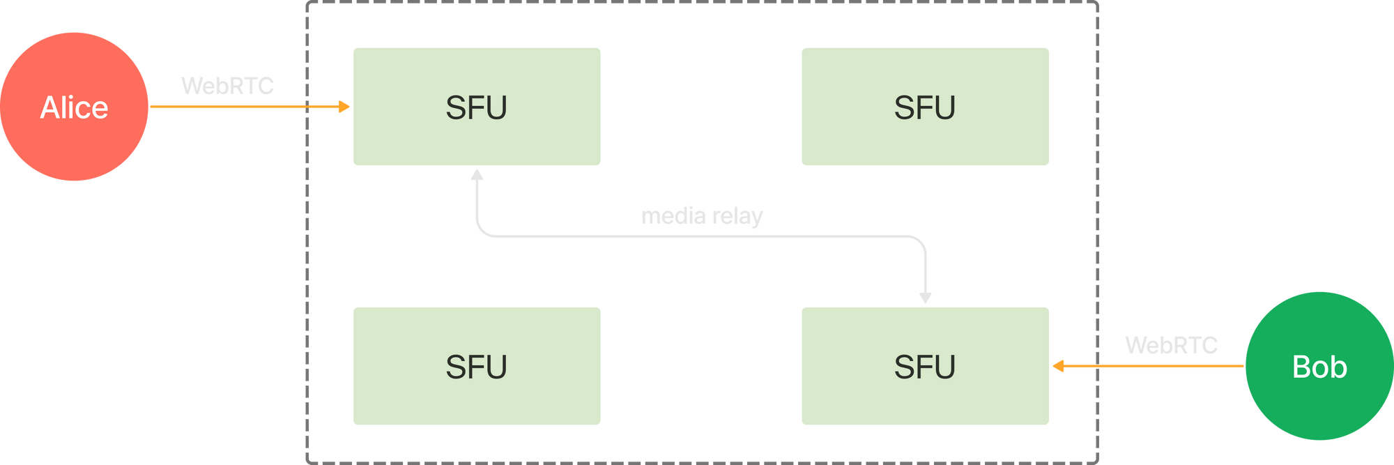 To cascade across SFUs, we needed a protocol to relay media between them. While the natural choice was WebRTC, given that our SFUs already use it to transmit data to clients, we decided against it for a few reasons: