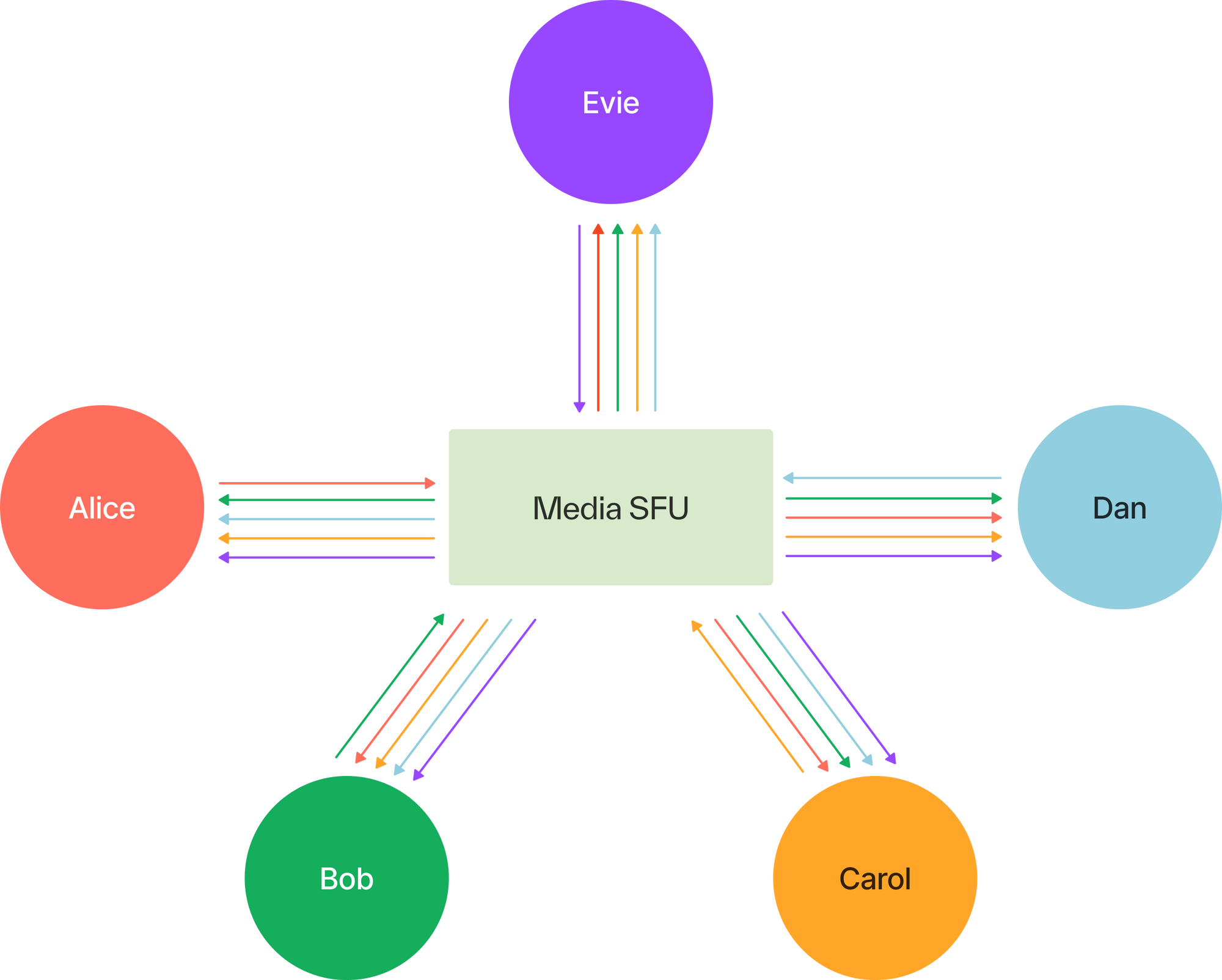 Any time you’ve used Zoom, Discord, or Twitter Spaces, you’ve interacted with a media server. A media server is responsible for allowing clients to do things like exchange camera or microphone data in real-time. It behaves quite differently from say, an HTTP server. A media server hosts sessions, which are stateful container objects. When clients (i.e. participants) wish to exchange media, they connect to a media server and join the same session. Media packets then flow from source to server, that—akin to a router—forwards them to one or more destinations in a matter of milliseconds.